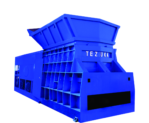 通常のスクラップシャーが縦方向にカッティング盤が下降して鉄スクラップを切断するのに対し、コンパクトャーは横方向にスライドして切断する構造になっています。